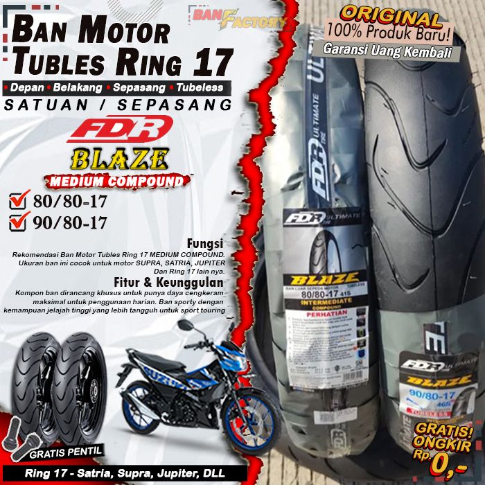 Ban Motor Tubeless FDR Blaze Ring 17 Ban Motor Vixion Ninja Supra Satria Tubles Depan Belakang Sepasang Ring 17