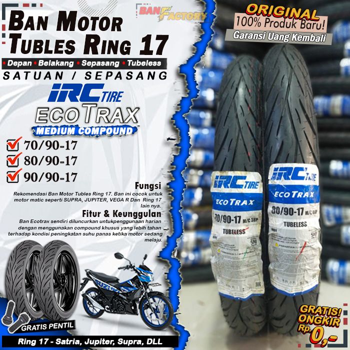 Ban Motor Tubeless IRC Ecotrax Ring 17 Ban Motor Vixion Supra Satria Jupiter Tubles Depan Belakang Sepasang Ring 17