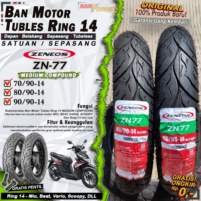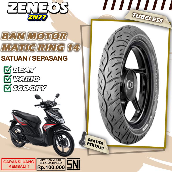 Ban Motor Matic Tubeless Zeneos ZN77 Ring 14 Ban Motor Beat Vario Scoopy Tubles Depan Belakang Sepasang Ring 14