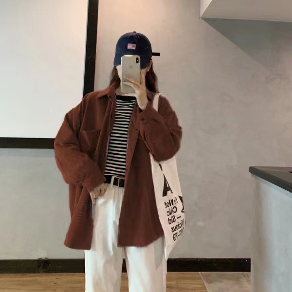 YURUMA KEMEJA KORDUROI WANITA GAYA KOREA RETRO BARU ATASAN KEMEJA LENGAN PANJANG LONGGAR