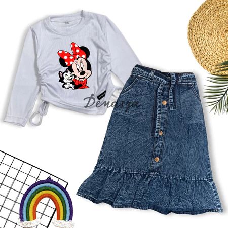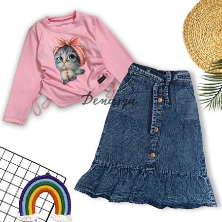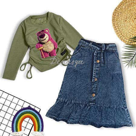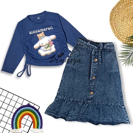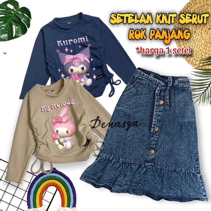SETELAN KNIT ANAK PEREMPUAN TERBARU / ROK JEANS PANJANG IMPORT / ATASAN KNIT MOTIF SABLON 2-12 TAHUN