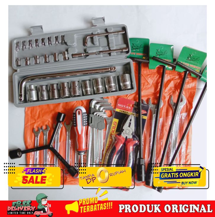 DISKON/ PAKET KUNCI RING PAS SET + KUNCI SOCK SET 27 PCS + KUNCI L + KUNCI Y + KUNCI T + OBENG + TANG KOMBINASI 6"