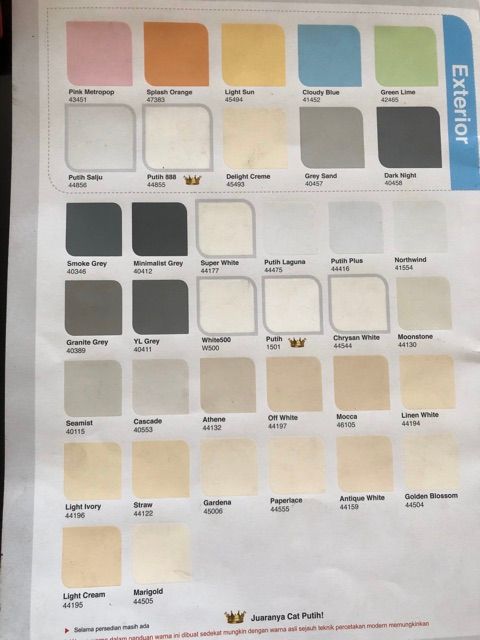 Putih 1501, White on White, Putih 888, PINGKY 43327, Beryl Green, Delight Creme 45493, Grey Sand 40457, Gardena 45006, Athene, Light cream 44195, Ivory CTL 45360, Moonstone, Cascade, Teardrop, Linen White, Paperlace, Marigold, Antique white, Magic purple 41371, Summer Sage, Granite Grey 40389, Marian’s Meadow, Paradise Green 42390, Mocha Mauve, Dreamland 42387, Grey pennant, Minimalist Grey, Smok Grey 40346, Seamist, Putih laguna, Toasty Grey, Jade Green, Brave beige, Blue Chiffon, Brave Ground, Woodland Mystery, Mint Sprig, Linen White 44194, t0bac0 Brown, Green Strip, Leather Brogue, Universal Grey, Garden Haven, Brilliant White 2290, Marble Falls, Mocca, Alloy Touch, Sorrel, Splash Orange, Ivory 45360, Light Ivory 44196