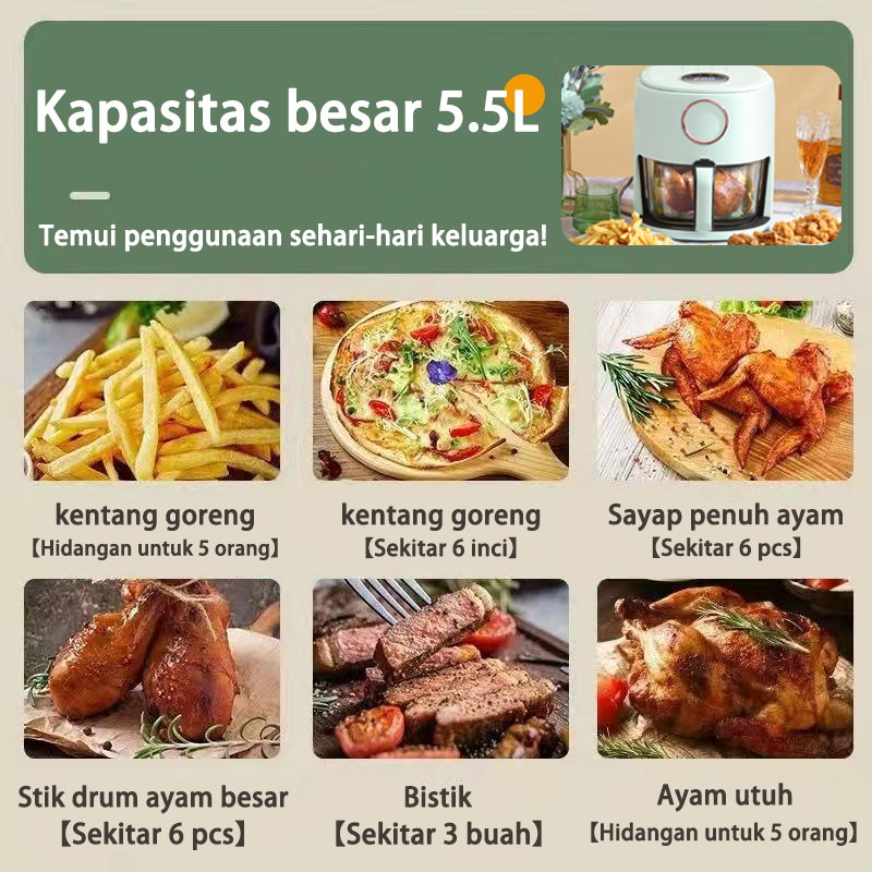 Air Fryer Low Watt 360° Kaca Visual 5.5L /4L Kapasitas Tinggi Hemat Listrik Tanpa Minyak Sentuhan Cerdas Kontrol Waktu
