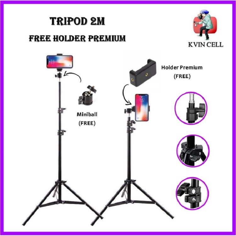 TRIPOD HP 2 METER HOLDER HP KAMERA RING LIGHT HANDPHONE ORIGINAL BESI 2,1M 2.1 M FREE HOLDER PREMIUM (TEBAL)