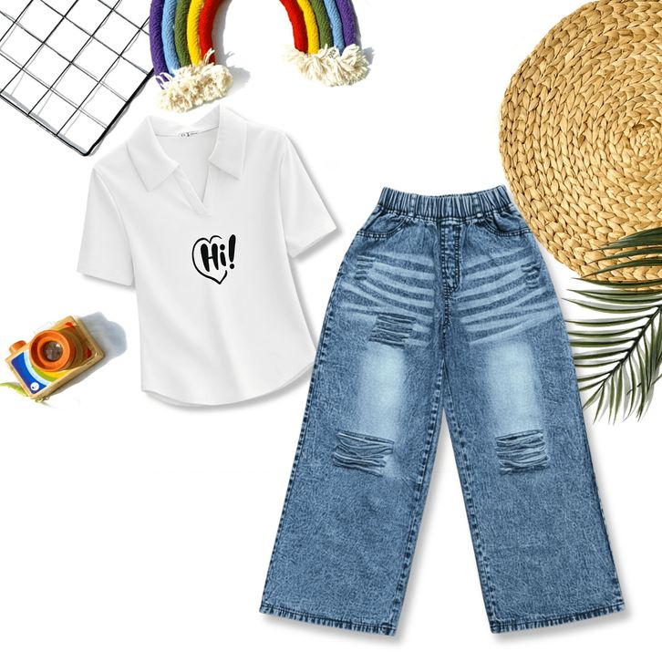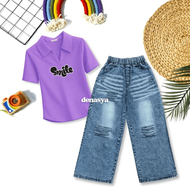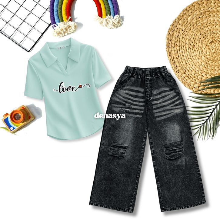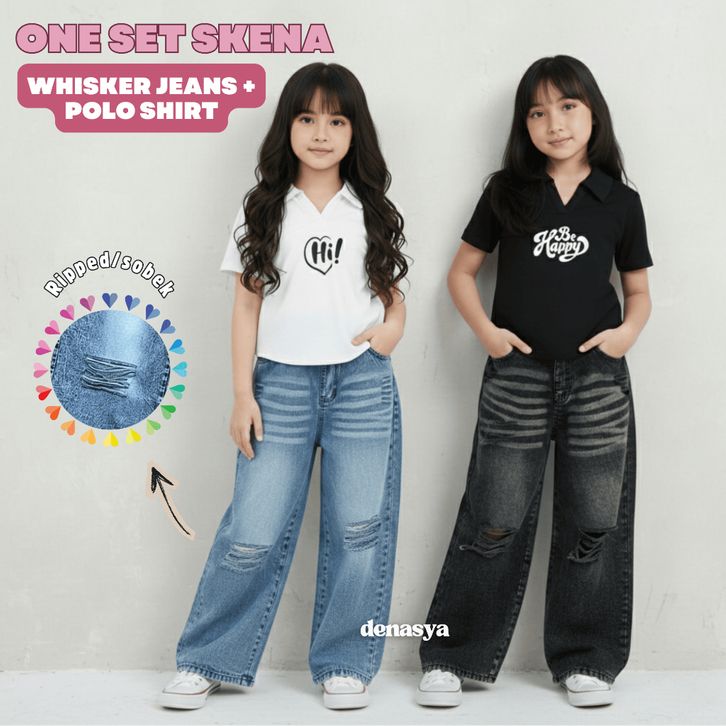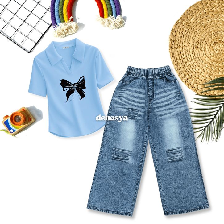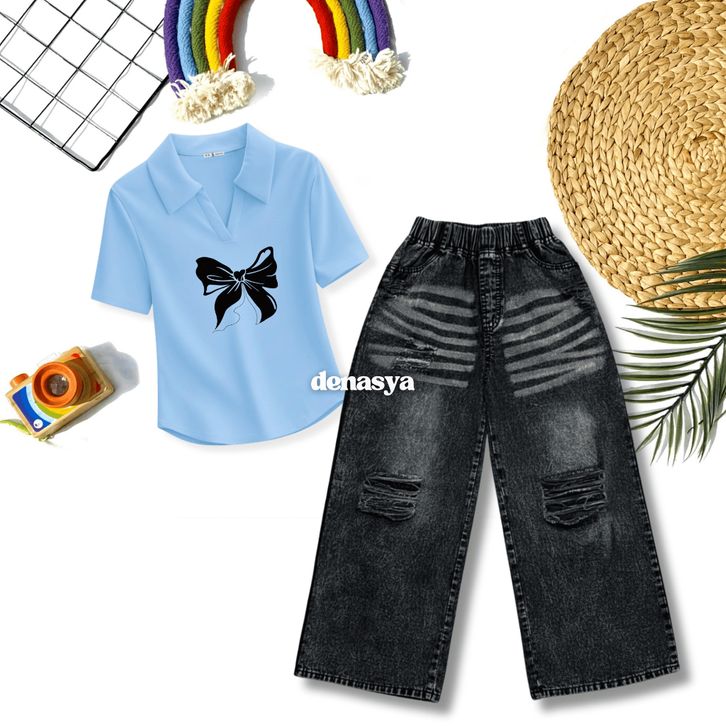 [Star] Setelan Anak Perempuan Usia 2-12Th Oneset Kaos Lengan Pendek Crop Top Polo&Calana Jeans Whisker Snowblack Import