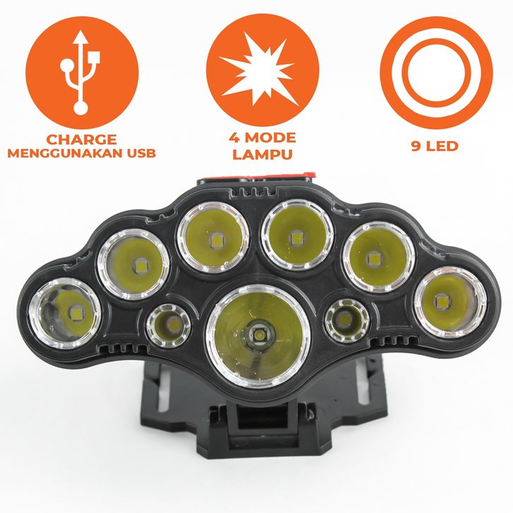 Suksestech Senter Kepala Charger Cas Super Terang 9 LED 4 Mode Free Usb Headlamp Anti Air SH-T09