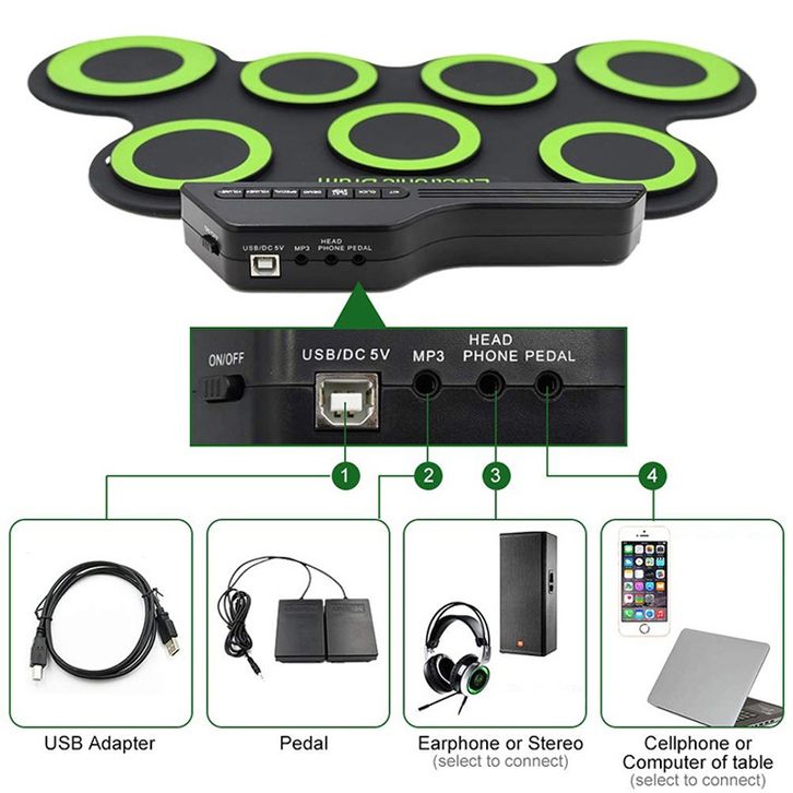 Rixton Drum Elektronik Portabel Digital USB 7 Bantalan Roll up Drum Set Silicone Electric Drum Pad Kit