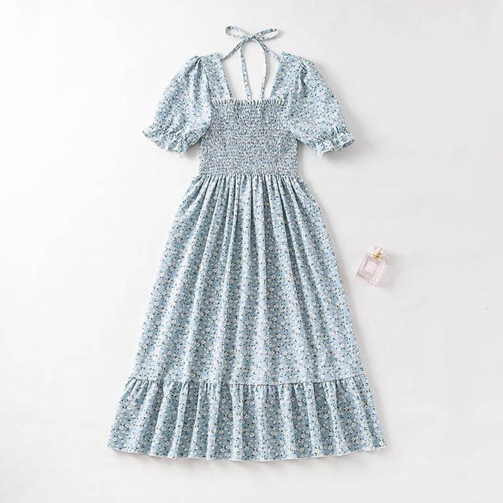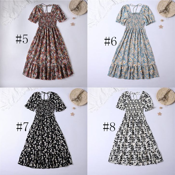 Dress motif bunga smocked korea lengan pendek dengan dasi belakang Free Ongkir