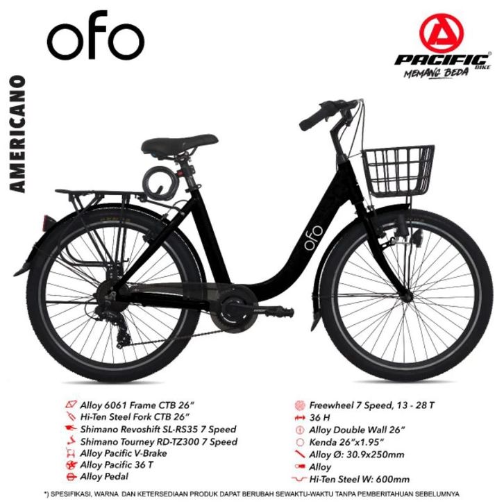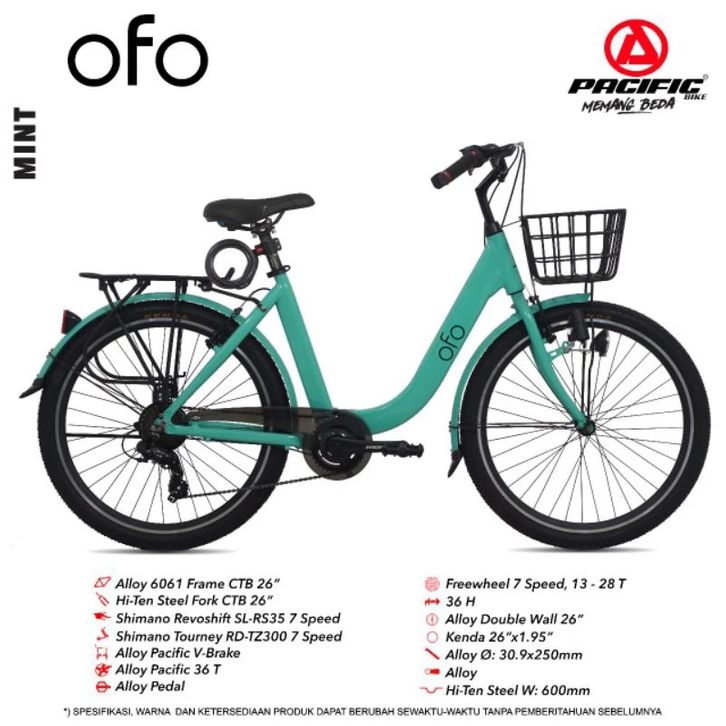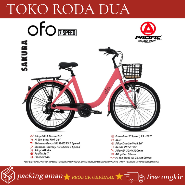 SEPEDA PEREMPUAN DEWASA PACIFIC OFO 26 INCH CITY BIKE ALLOY SHIMANO 7 SPEED KERANJANG