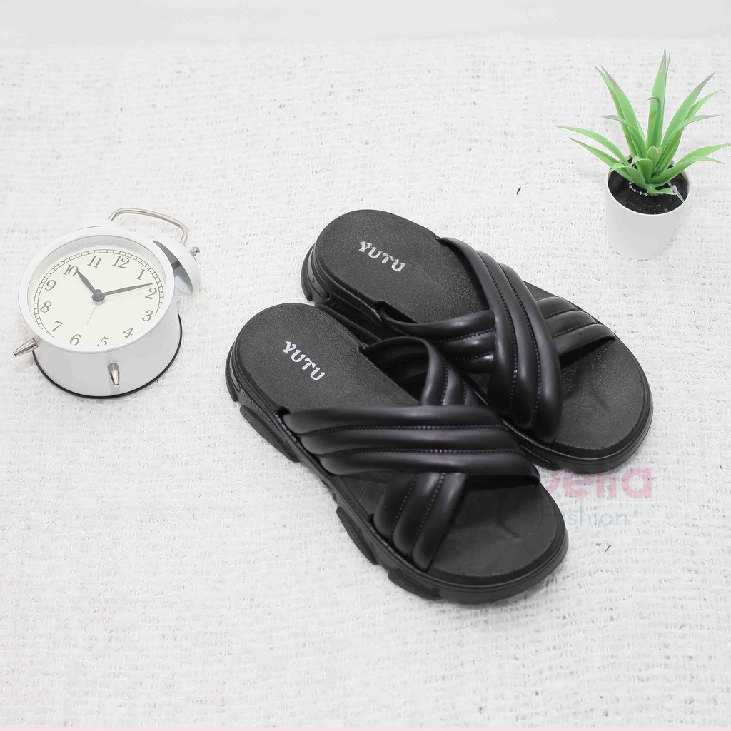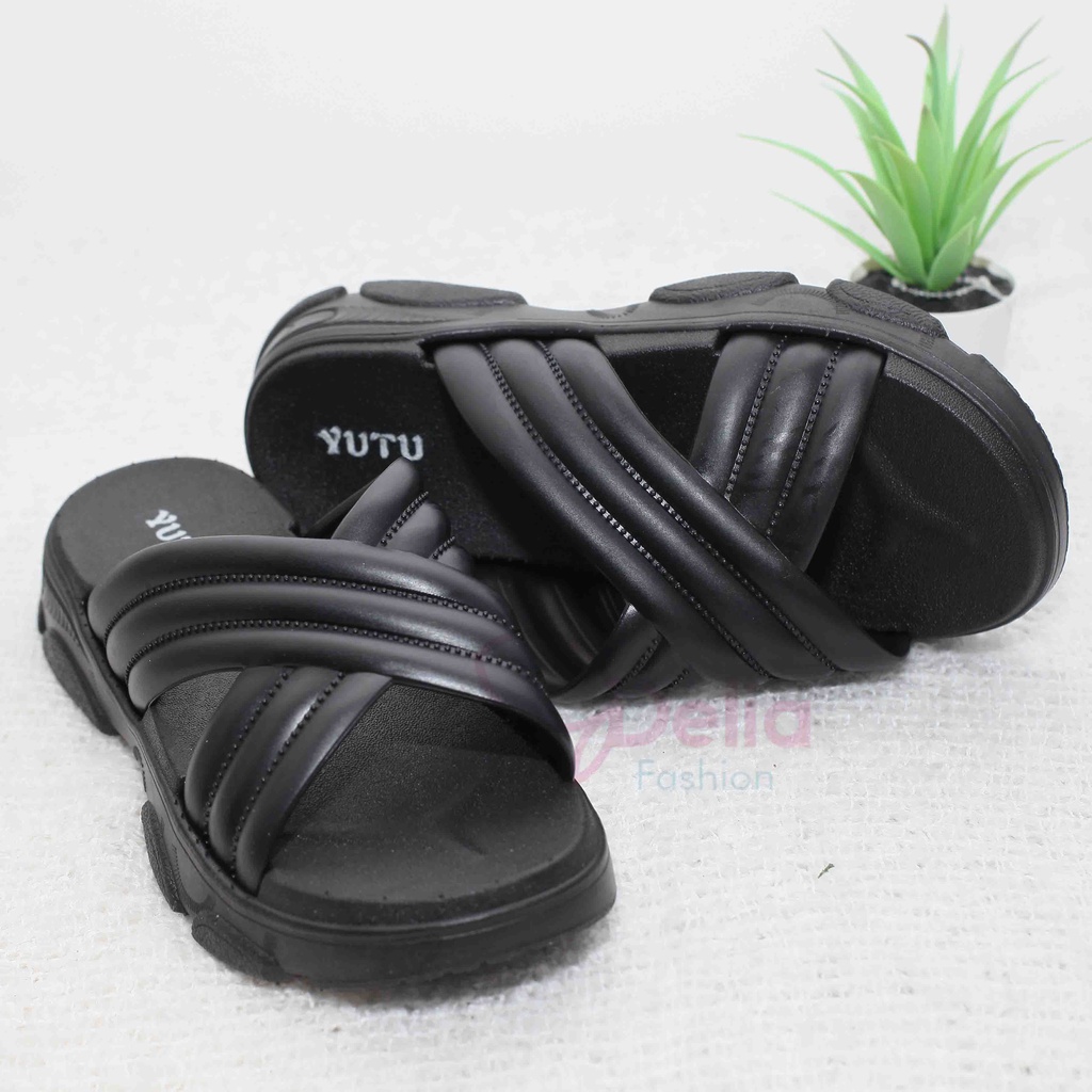 SANDAL WANITA TALI SILANG MODEL KEKINIAN TEBAL 3CM KOREAN STYLE BAHAN KARET EVA RINGAN DAN ANTI LICIN KHUSUS WARNA HITAM