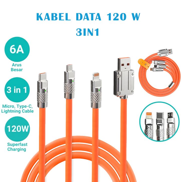 Kabel Data 120 W 3in1 Micro Usb Type C Lightning Fast Charge Kabel Data Silikon 6A Qucik Charge Support Fast