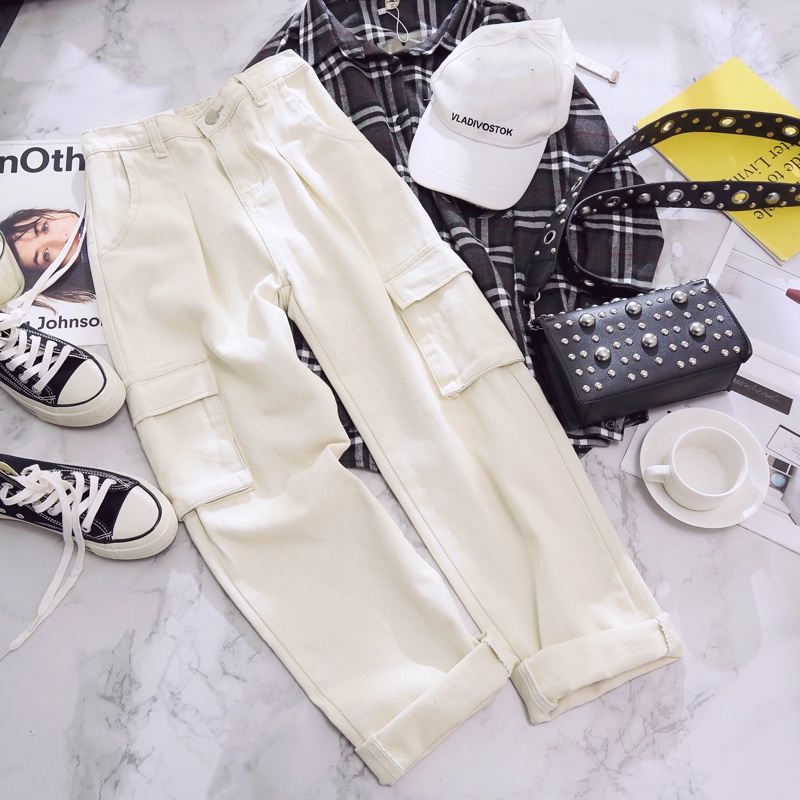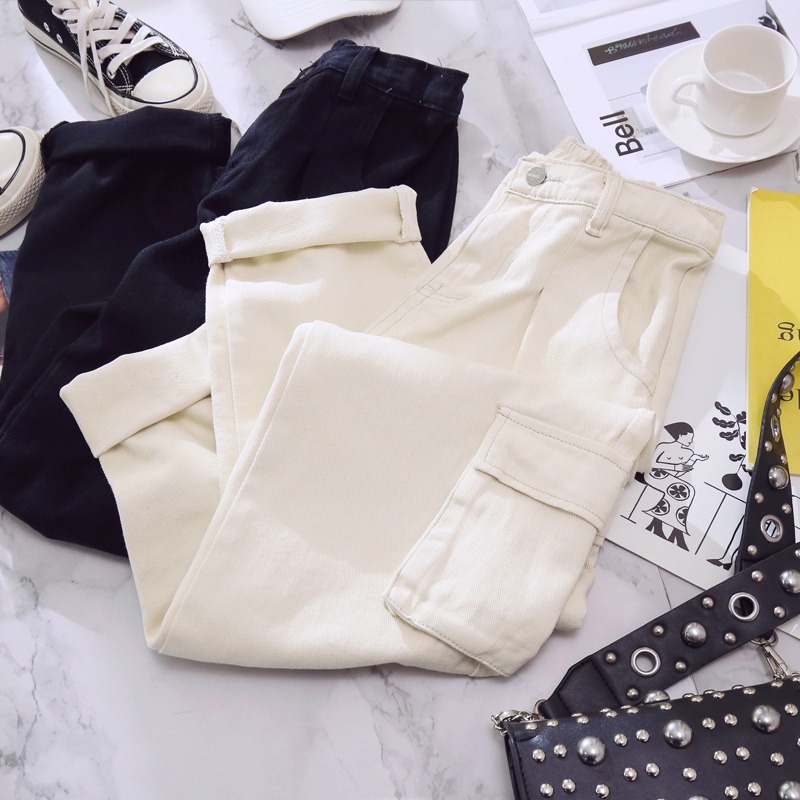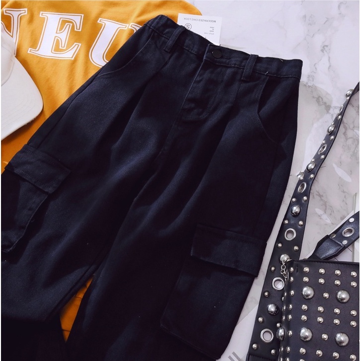 CARGO JEANS--KOREAN HIGHWAIST CARGO CELANA JEANS WANITA IMPORT (REALPICT)