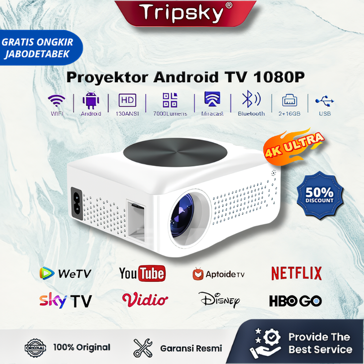 Proyektor Mini 1080P 7000 Lumen Smart Projector Android Tv Layar Tancap 9.0 Ram 2G/16G Infocus Murah Portable Untuk Hp