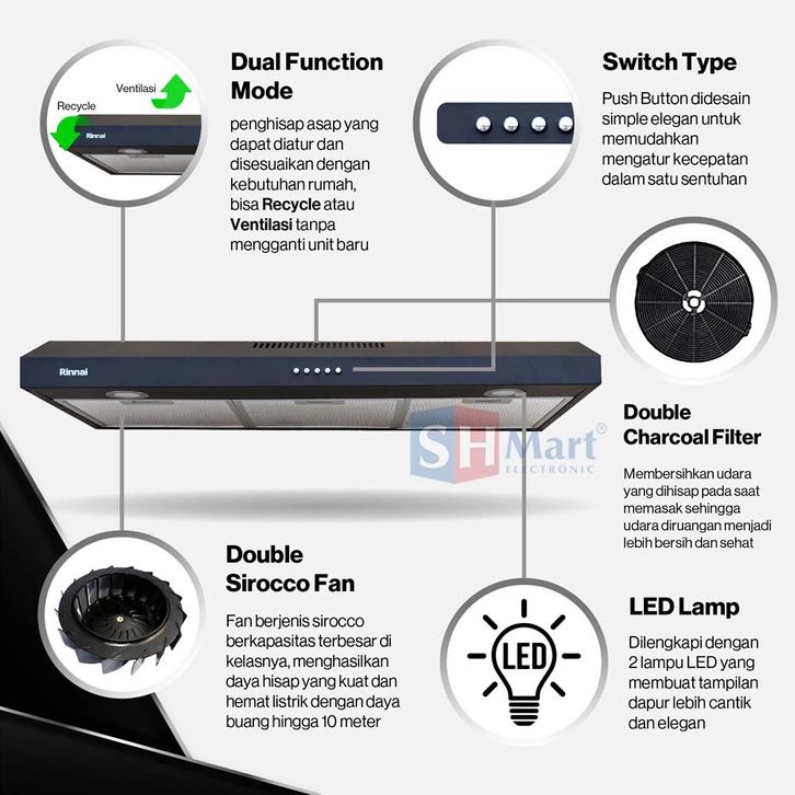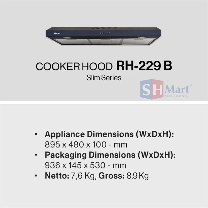 COOKER HOOD RINNAI 90 CM SLIM RH-229B RH229B RH-229SS RH229SS PENGHISAP ASAP DAPUR RINNAI GARANSI RESMI