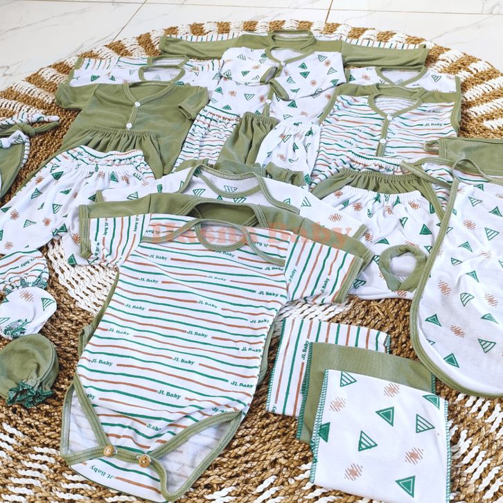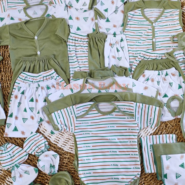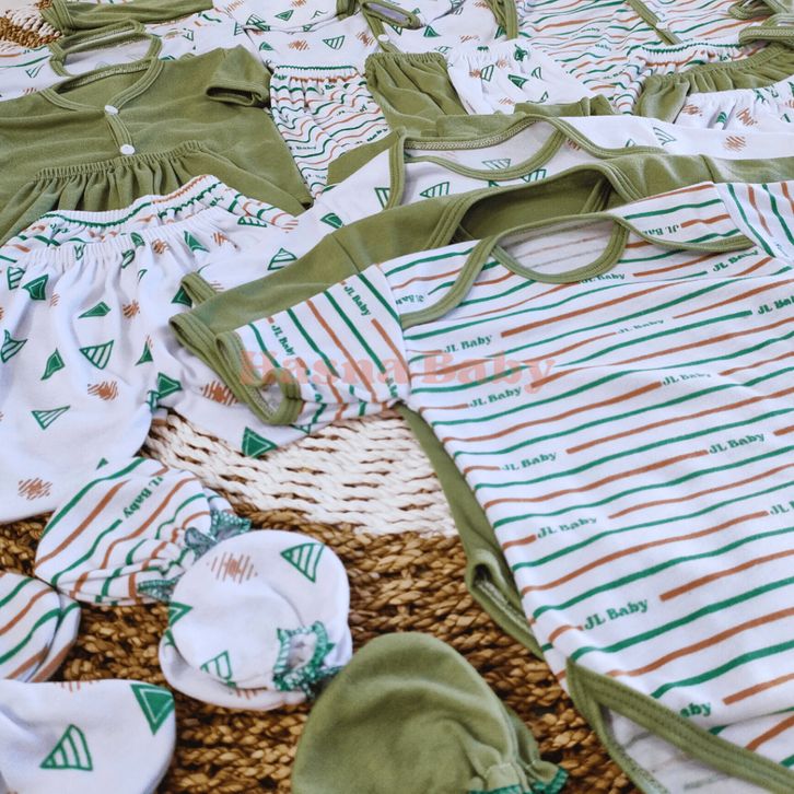 BAJU BAYI 36 PCS PAKET LAHIRAN LENGKAP CELANA BAYI BARU LAHIR SERI HIJAU SAGE KARAKTER LUCU SARTAKI JUMPER POPOK TALI