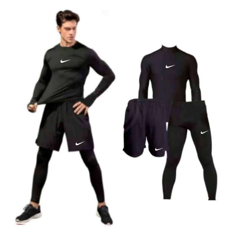 3 IN 1 - STELAN OLAHRAGA PRIA BAJU MANSET BASELAYER LENGAN PANJANG CELANA LEGGING DAN CELANA PENDEK SPORT