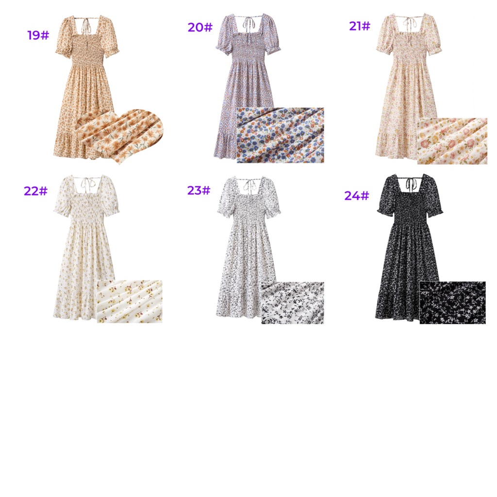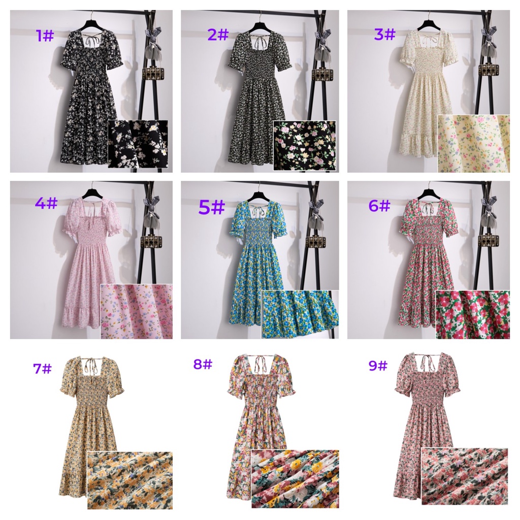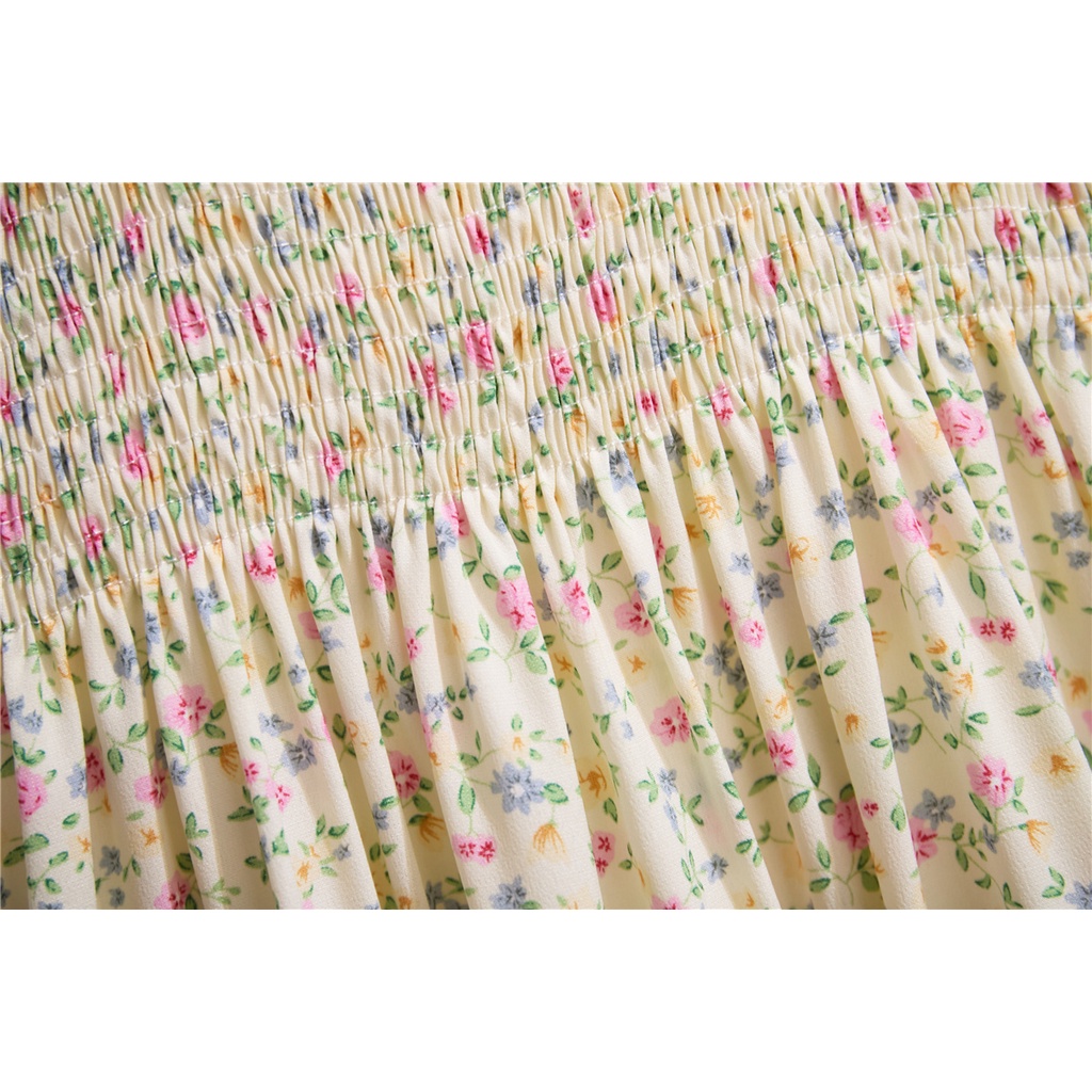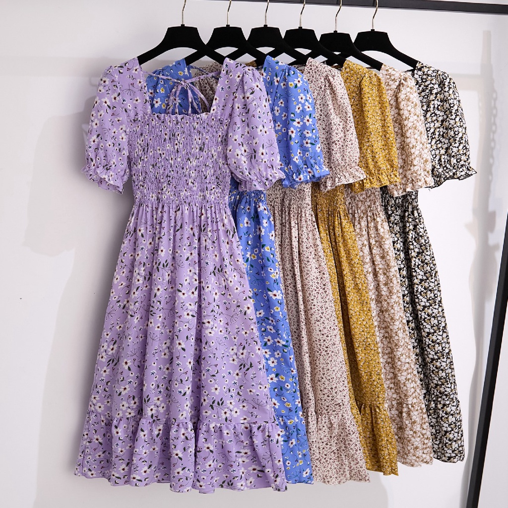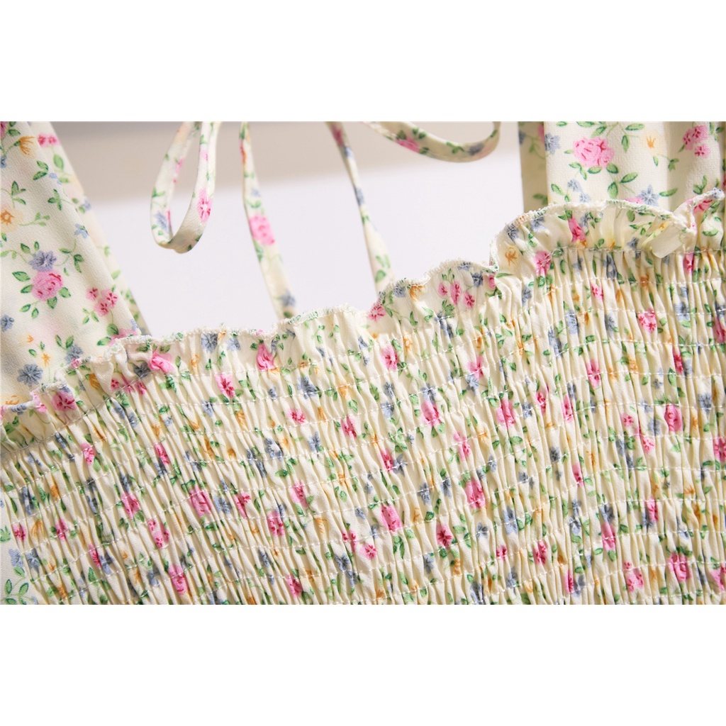 FLORAL MIDI DRESS KOREA STYLE PANTAI BAJU DRESS WANITA BAJU PESTA LENGAN PENDEK GAUN DADA LIPIT MUSIM PANAS DRESS BALI