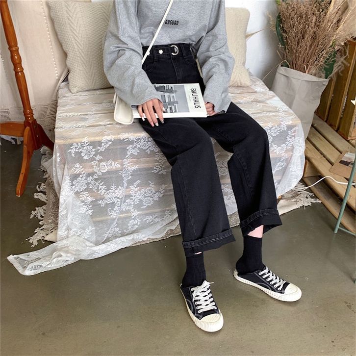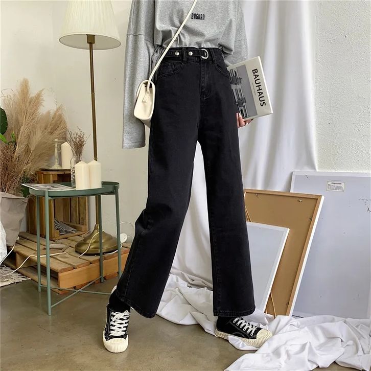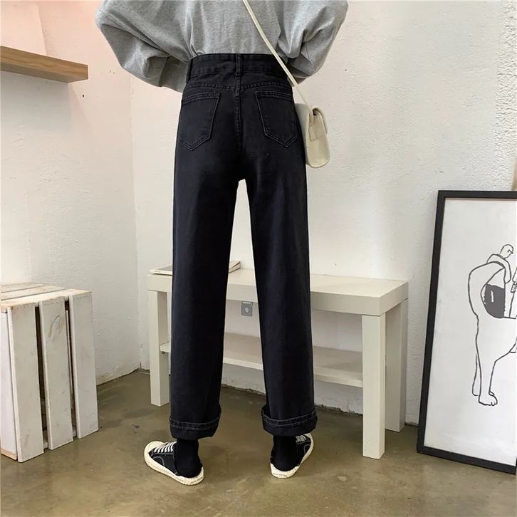 Celana Kasual Wanita / Denim celana wide-leg perempuan high-waist longgar lurus-kaki celana panjang