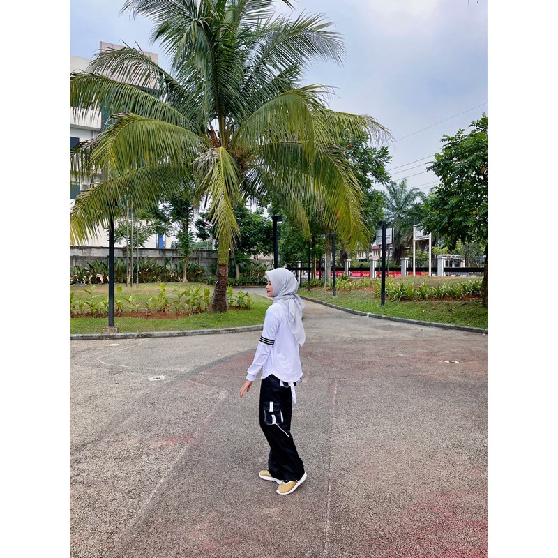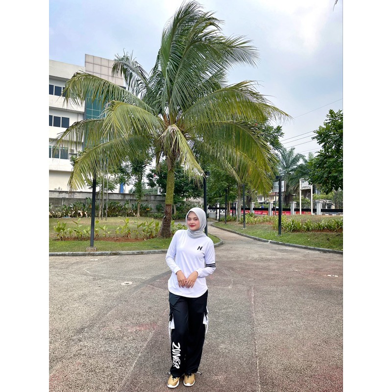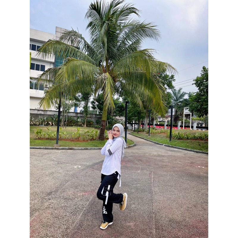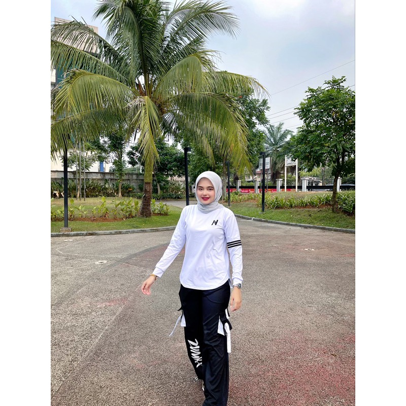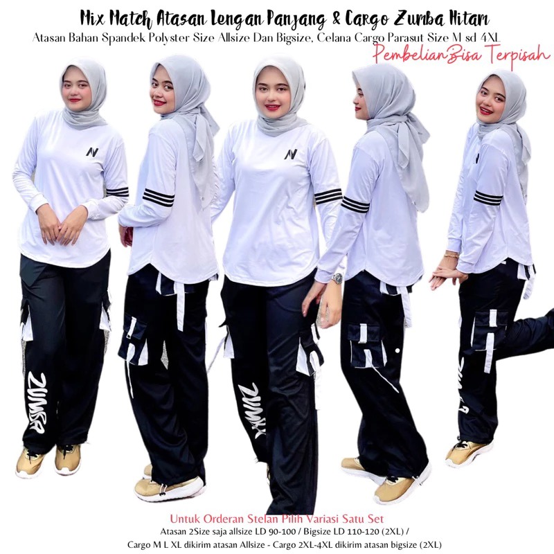 Mix Match Atasan N Lengan Panjang Putih Lis Hitam dan Cargo Zumba Hitam List Putih Bahan Spandek Polyster Untuk Stelan O