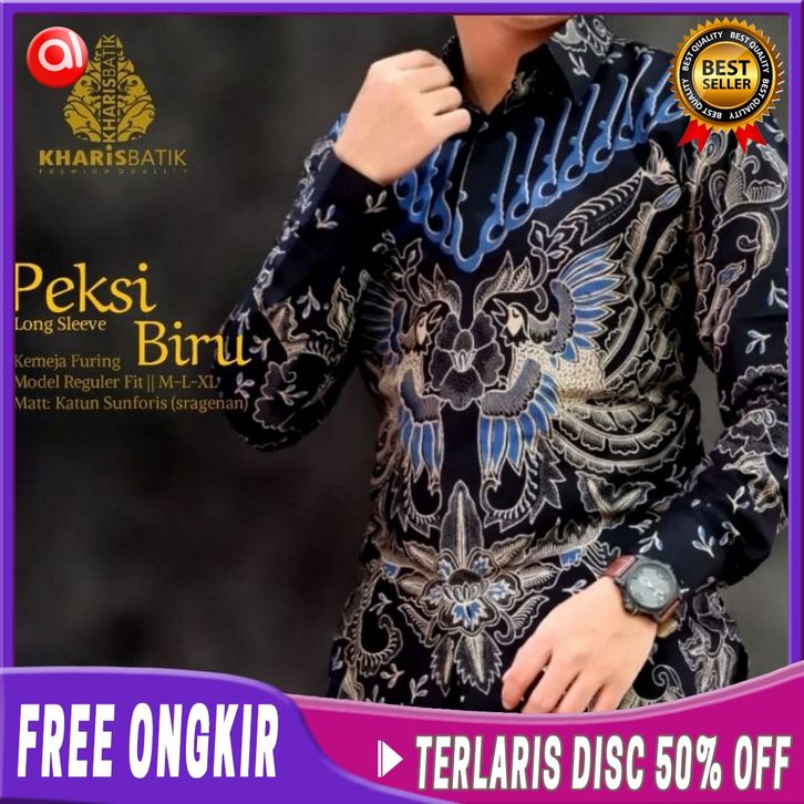 BEBAS ONGKIR BATIK Motif Peksi Blue Hem Atasan Kemeja Baju Batik Pria S M L XL XXL