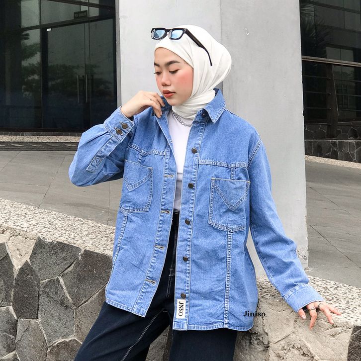 JINISO JAKET JEANS OVERSIZE SAFARI BABY BLUE | JAKET JEANS JINISO BIRU | JAKET JEANS WANITA MURAH ORIGINAL
