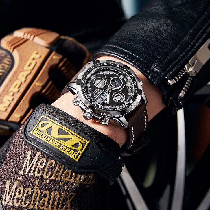 BIDEN Jam Tangan Pria Multifungsi Digital&Analog Olahraga Kasual Tali Kulit Jam Tangan Cowok