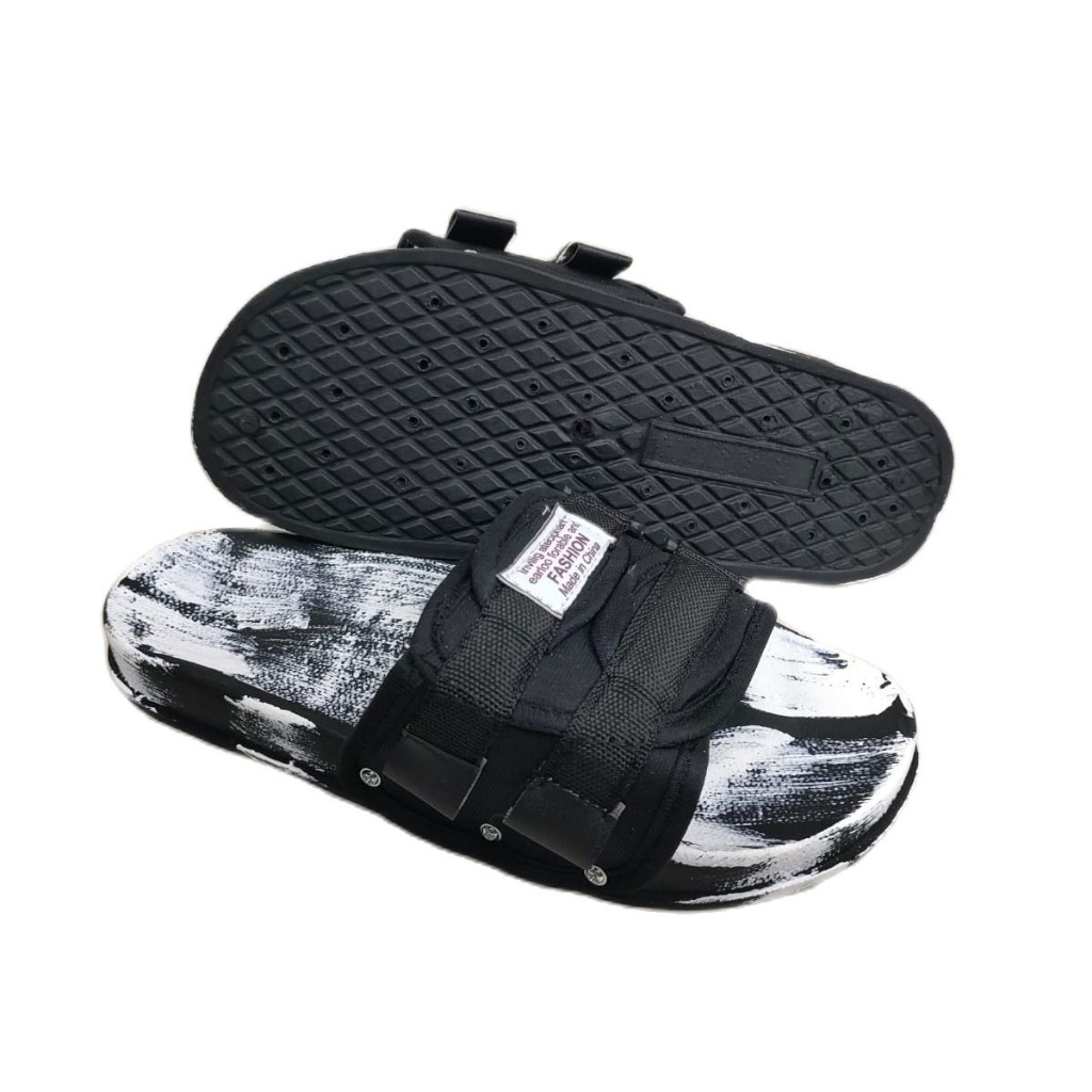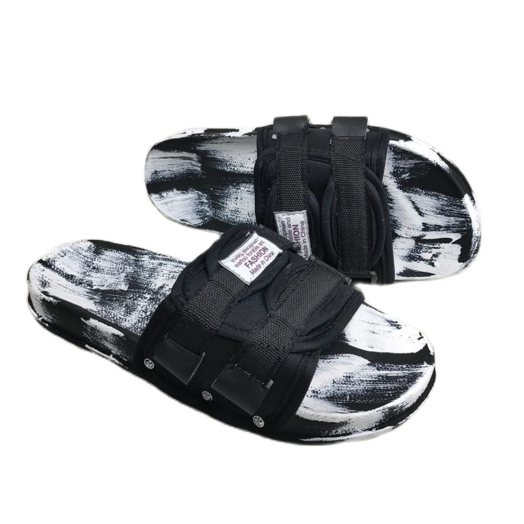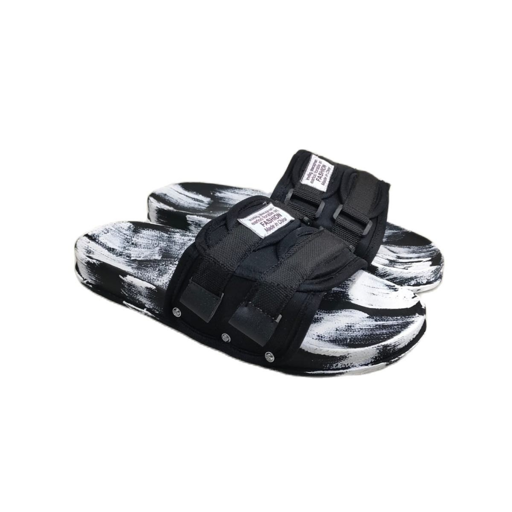 Agnia - Fashion Oval Loreng Putih Hitam - Sandal Slop Pria Terbaru / Sandal Pria/Sandal Slop Pria Kekinian 2025