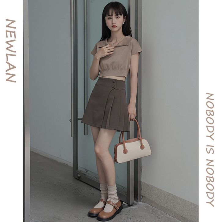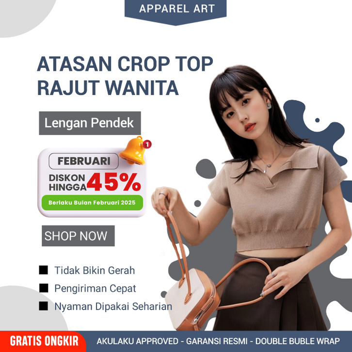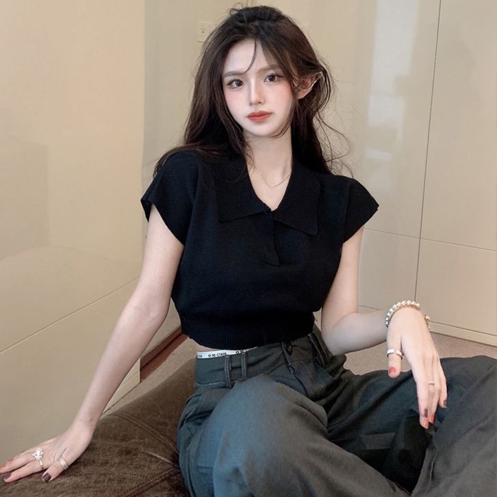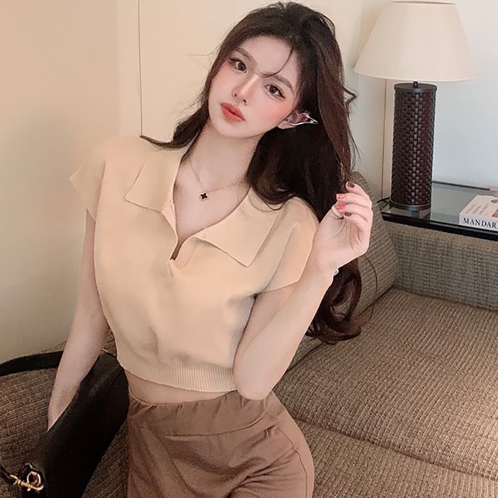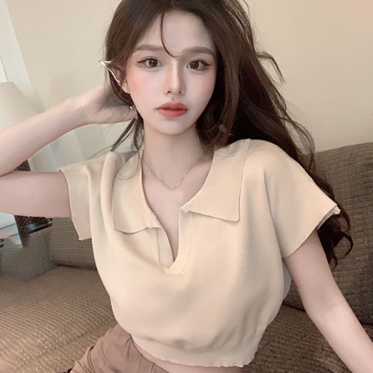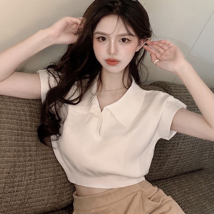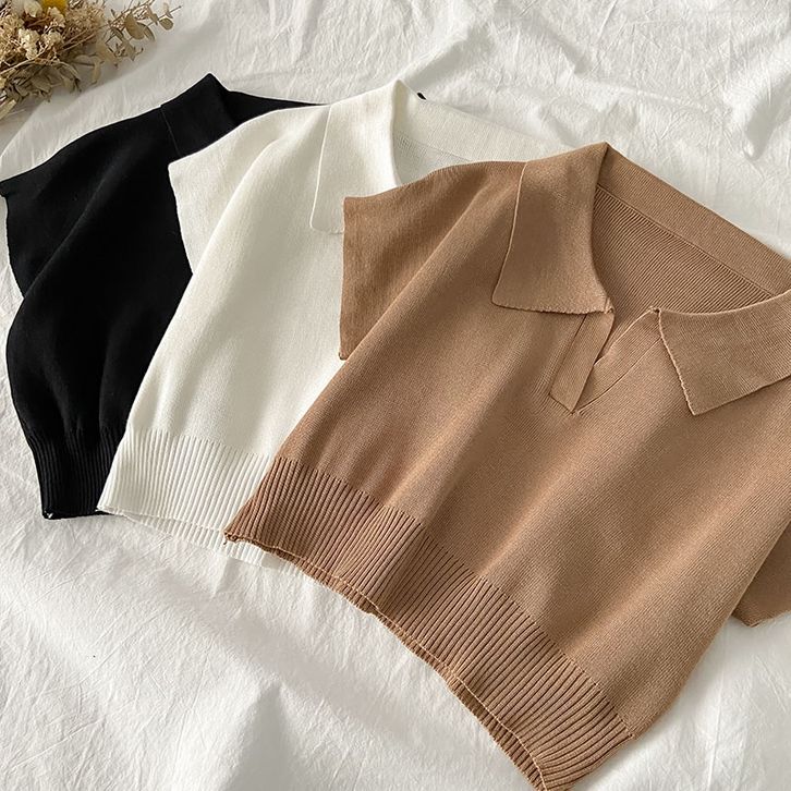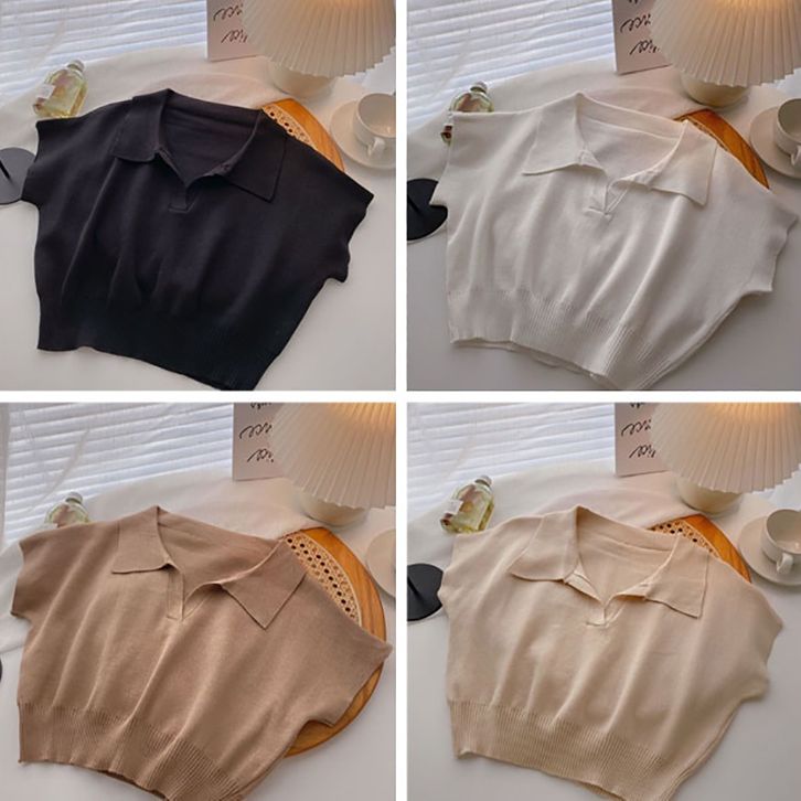Atasan Crop Top Rajut Cewek Kaos Lengan Pendek Knit Polo T Shirt Polos Pakaian Krop Ootd Style Cewek Kekinian