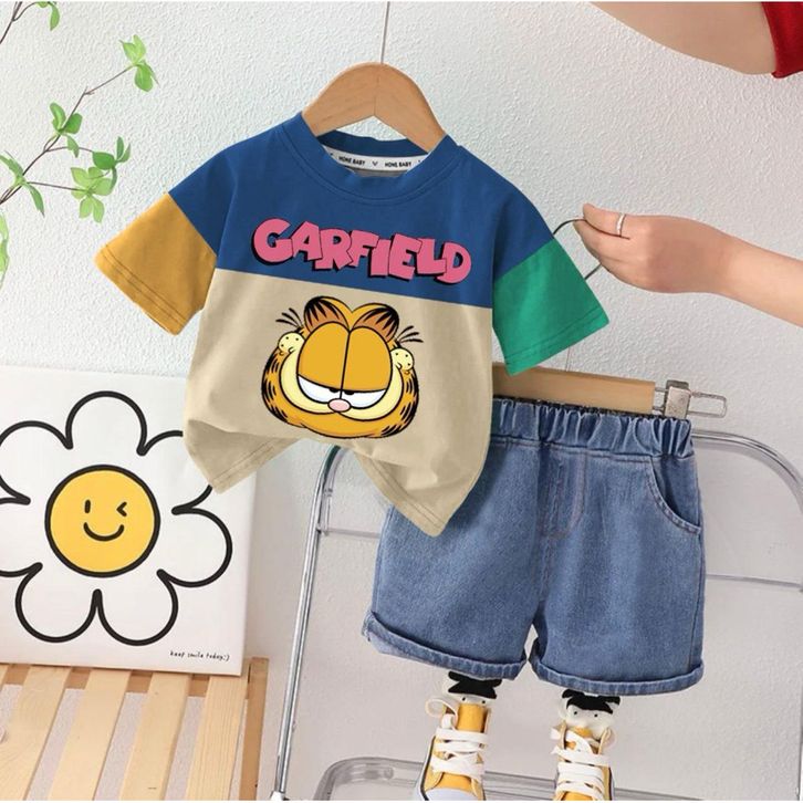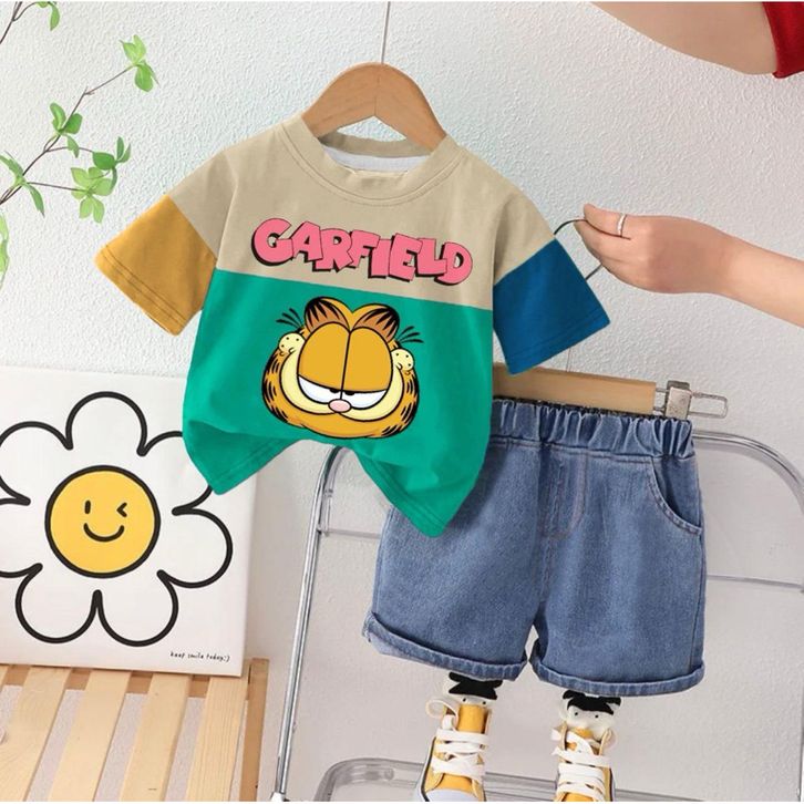Setelan kaos anak celana pendek anak denim motif GARFIELD terbaru laki laki dan perempuan 1-5 tahun ardan baju anak