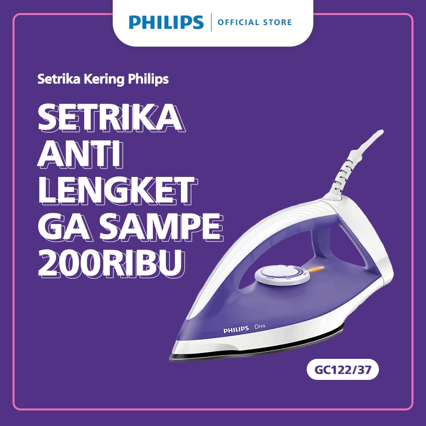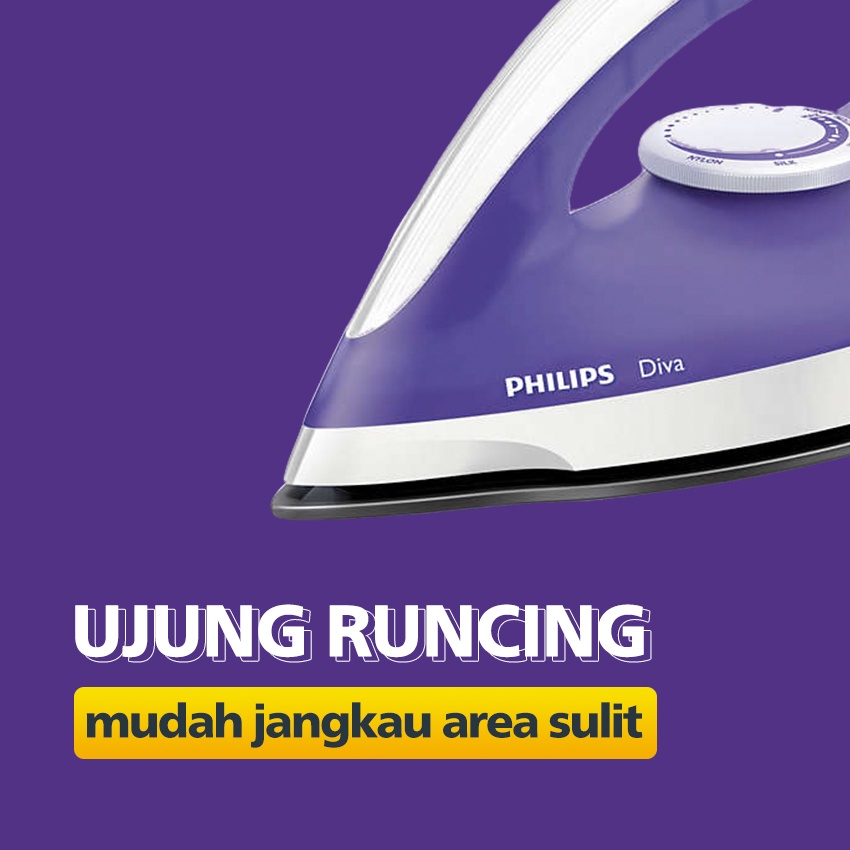 PHILIPS SETRIKA KERING DIVA GC122/37 - UNGU, TAPAK NON-STICK, UJUNG RUNCING DENGAN ALUR KANCING, SETERIKA