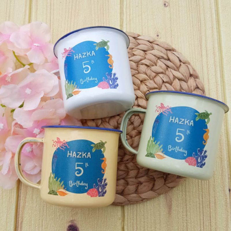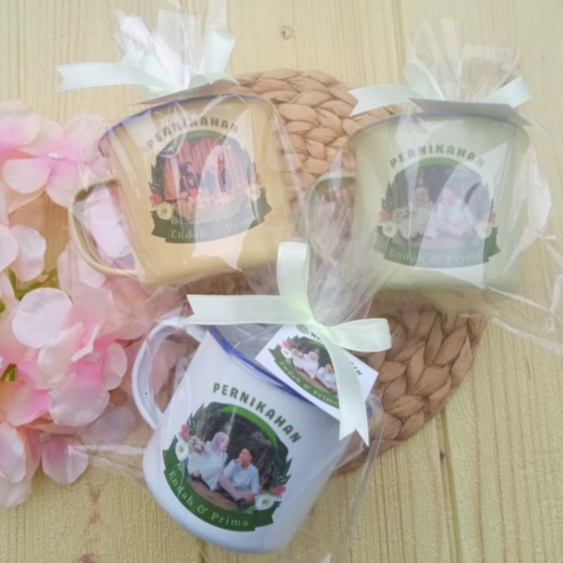 SOUVENIR GELAS MUG CANGKIR ENAMEL CUSTOM KEMAS PLASTIK PERNIKAHAN AQIQAH KHITAN ULTAH