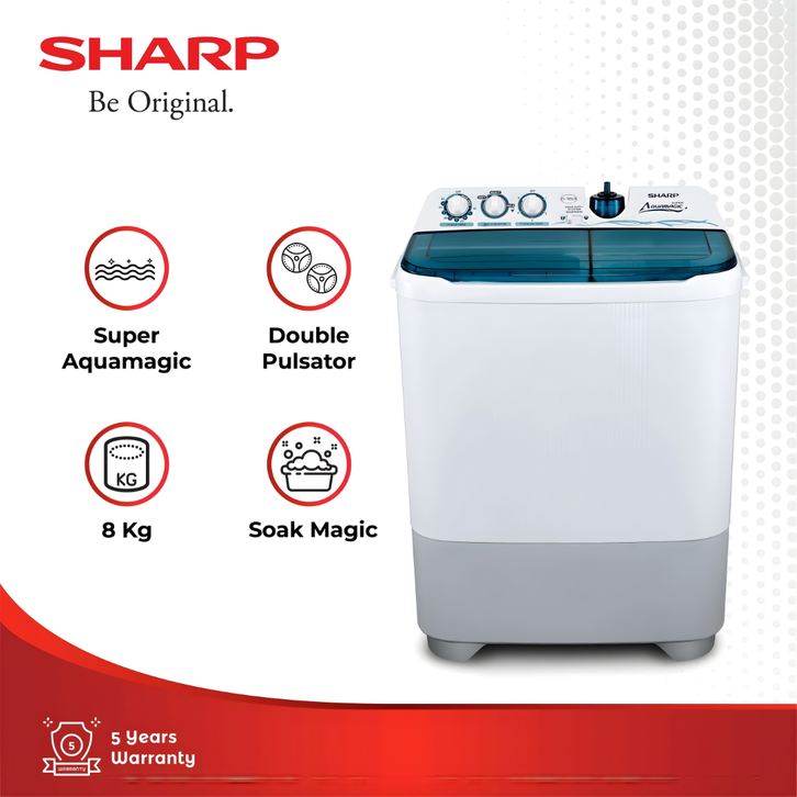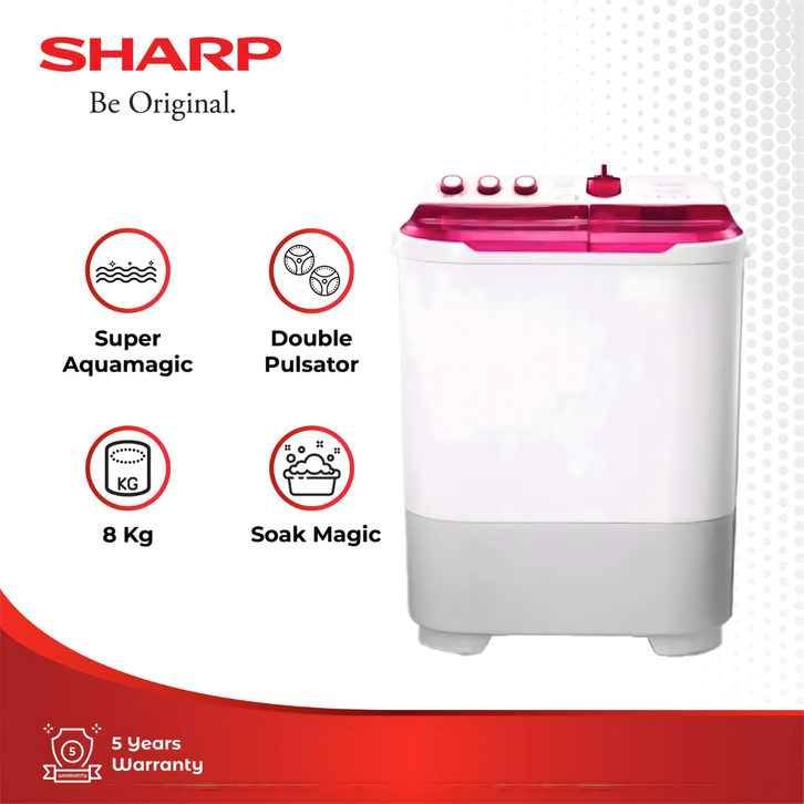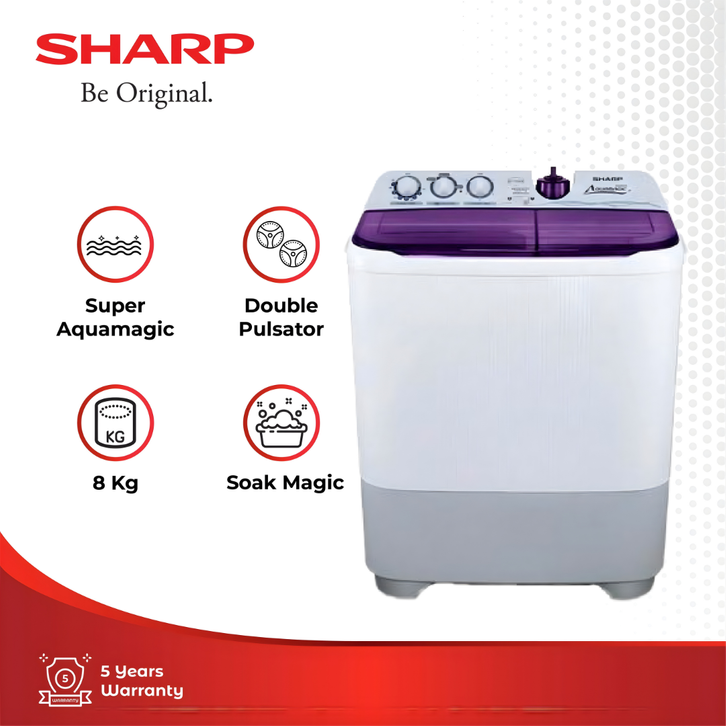 SHARP Mesin Cuci 2 Tabung ES-T85CR-BK/VK/PK , BLUE ,VIOLET ,PINK ,KAPASITAS 8KG ORIGINAL, GARANSI RESMI