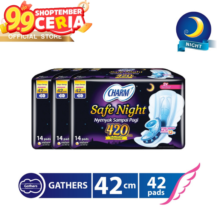 (PROMO ISI 3) Charm Pembalut Safe Night 42cm Gather 14 pads - 3 packs / Pembalut Wanita Charm / Pembalut Charm Night