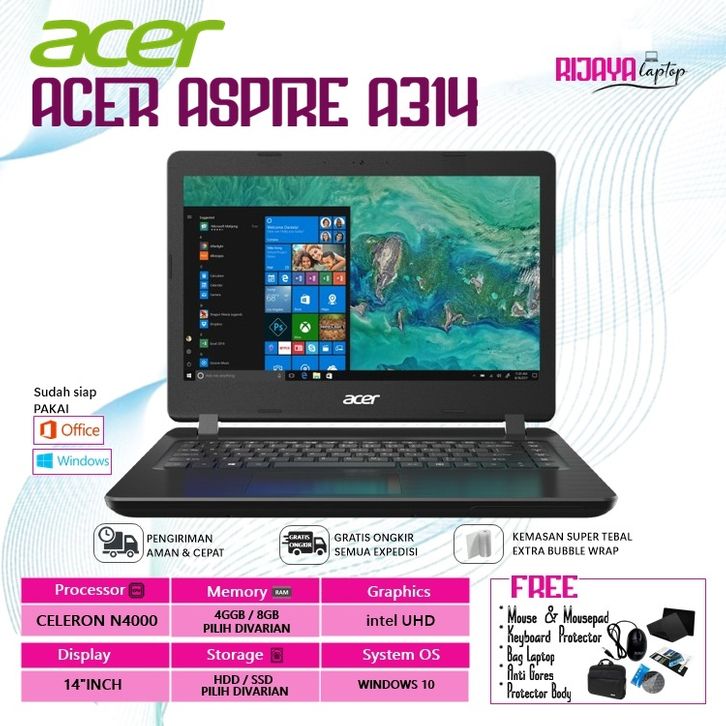 [ PROMO ] LAPTOP ACER ASPIRE 3 A314 CELERON N4000 RAM 8GB/1TB HDD WIN10 FREE TAS LAPTOP-MOUSE