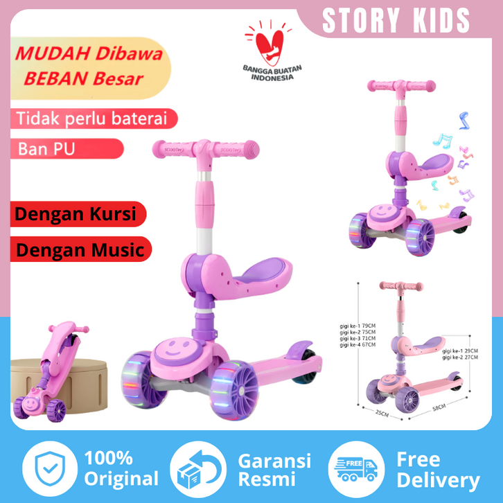 [Mall] Skuter Anak Roda 3 Scooter Otoped Anak Perempuan 2 in 1 Bisa Lipat Dengan Lampu Musik Dilengkapi Kursi SNI