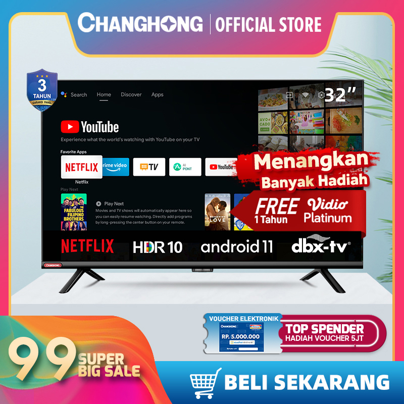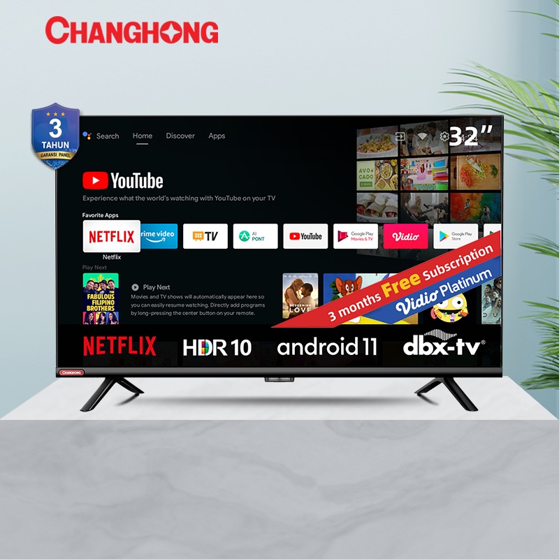 TV SMART CHANGHONG 32 INCH NEWEST ANDROID 11 FRAMELESS SMART TV DIGITAL LED TV HD (L32G7N)-NETFLIX-YOUT