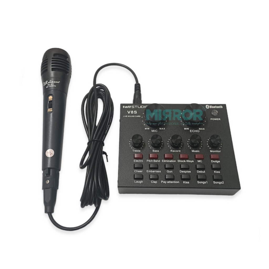 SATU PAKET ALAT KARAOKE MIXER MINI SOUNDCARD BLUETOOTH V8S TAFFSTUDIO & 2 MIC GRATIS SPLITER