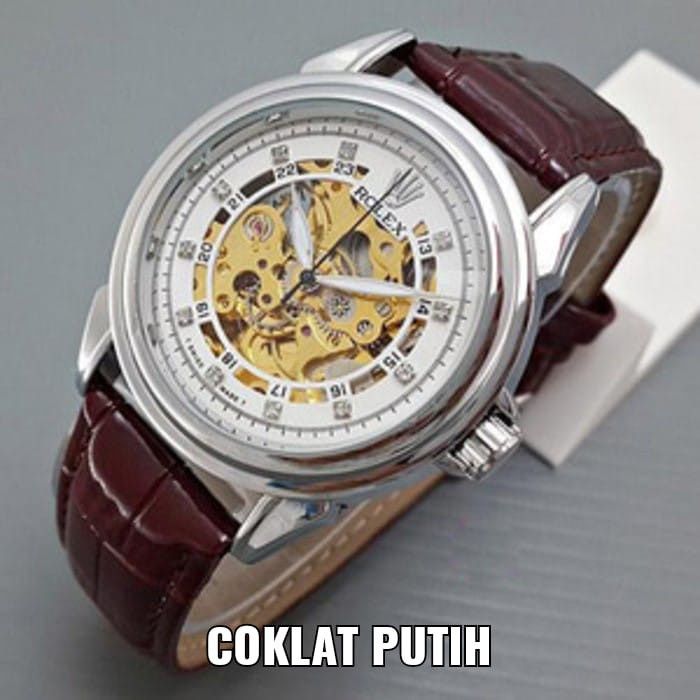 Jam Tangan Wanita Rolex Skleton Automatic Permata Tali Kulit Body Bulat Free Box Kancing