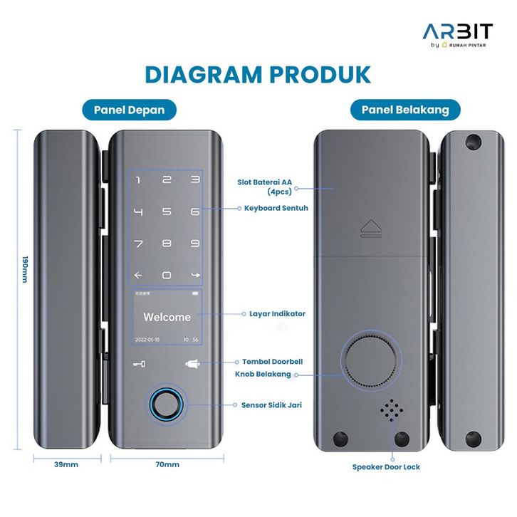 ARBIT WiFi Door Lock Without Handle Fingerprint TUYA - Hitam Non Glass