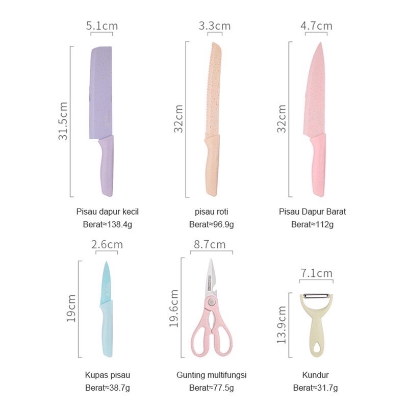 Set Pisau Dapur 6 in 1 Kitchen Knife Stainless Steel Premium Anti Lengket Pisau Dapur Tajam Awet Anti Karat Warna Pastel