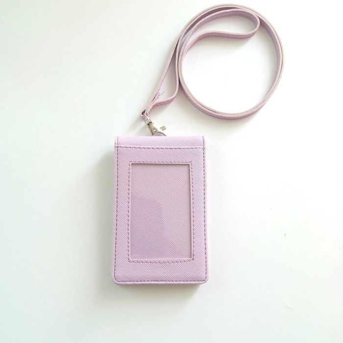 Lanyard ID Card Holder Name Tag Kulit Dua Sisi Bolak Balik Mika Kancin - Merah Muda