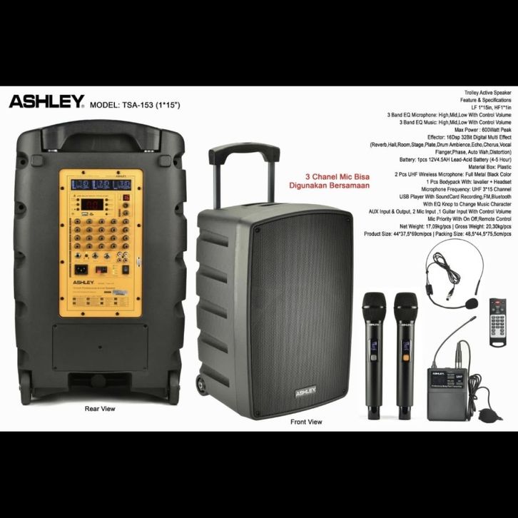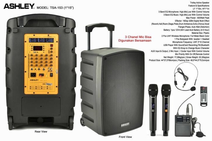 Speaker Portable 15 Inch Ashley TSA153 Tsa 153 Bluetooth 2 Mic Wireless Ori