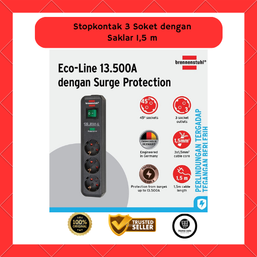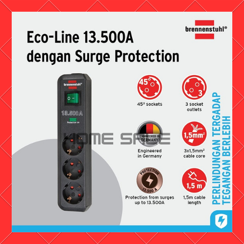 Colokan Anti Petir Eco-Line Surge Protection 13.500 A Stopkontak 3 Soket dengan Saklar 1,5 m