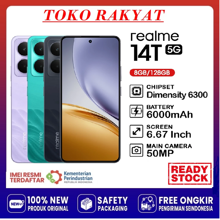 (BEBAS ONGKIR) Hp realme 14T 5G 8+256GB | Dimensity 6300 | Camera 50MP+2MP | Batery 6000mAh | Garansi Resmi