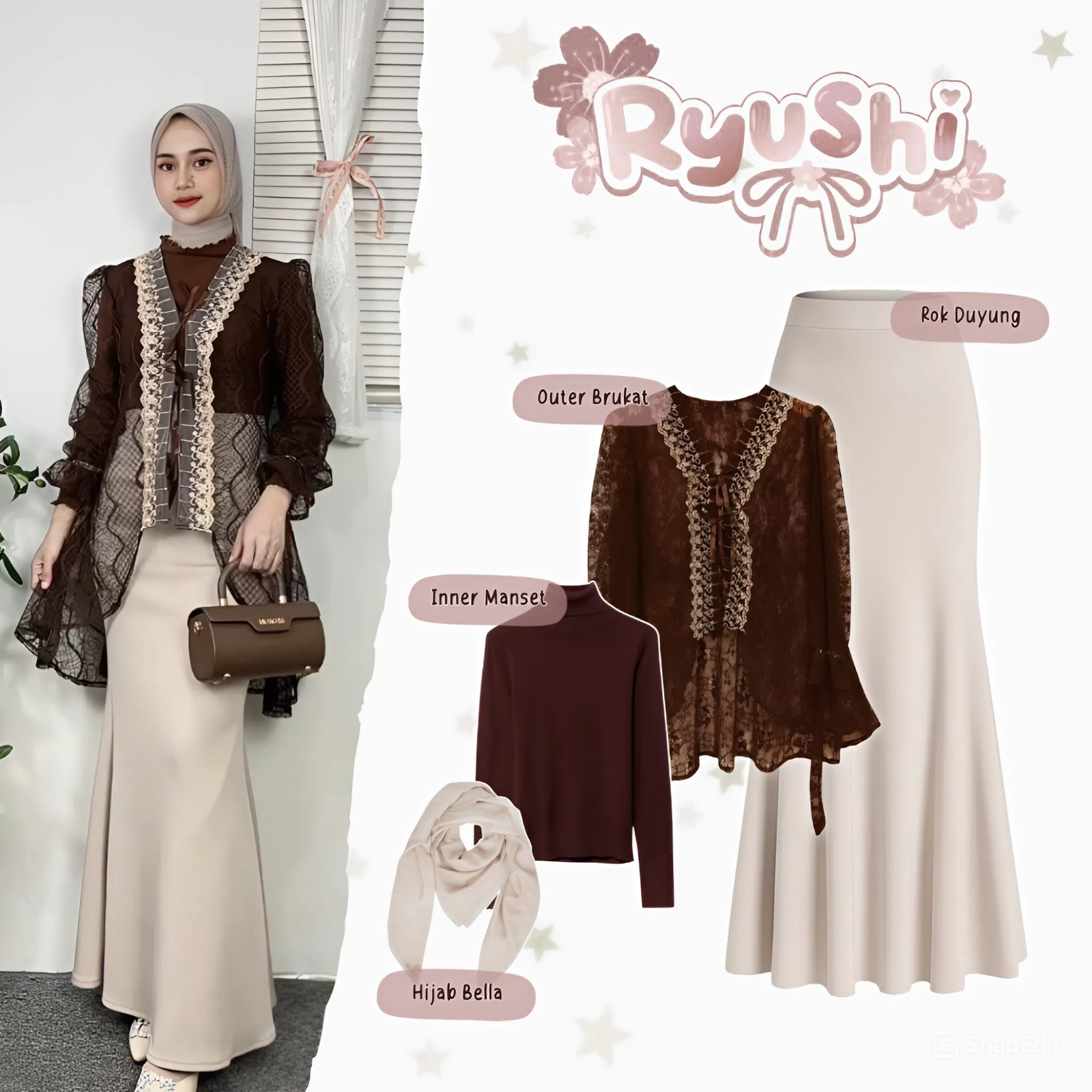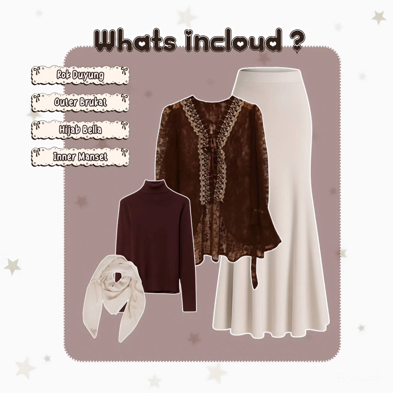 One Set Lebaran Ootd Kondangan Mahogany Set Korean Style Earth Vibes Outer Brukat Rok Duyung Manset Hijab SET AE346