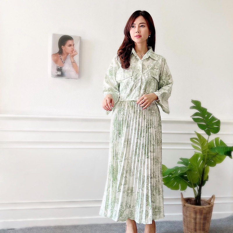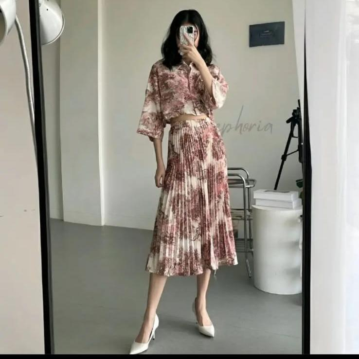 AFI - EC - ONE SET WANITA NATURE KOREAN VINTAGE KEMEJA CROP & ROK MIDI PLISKET