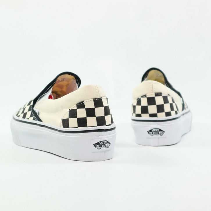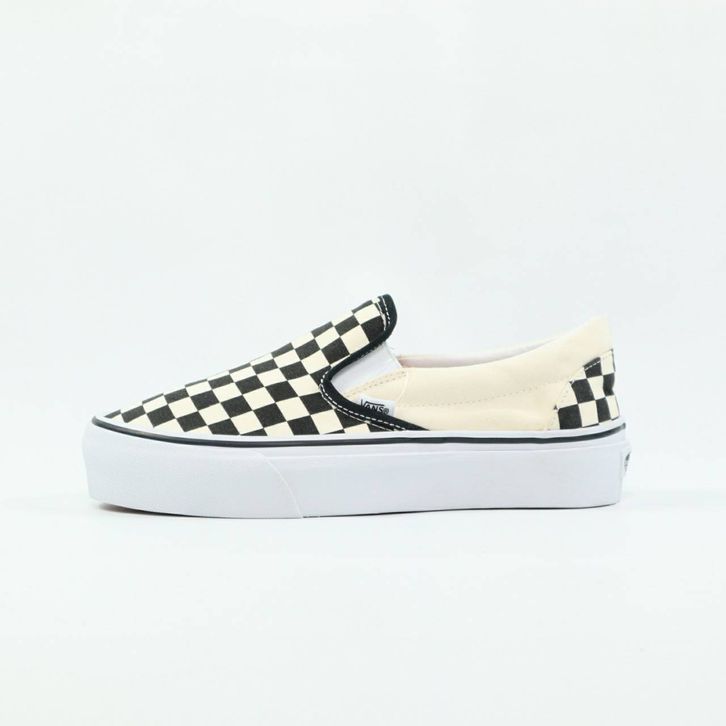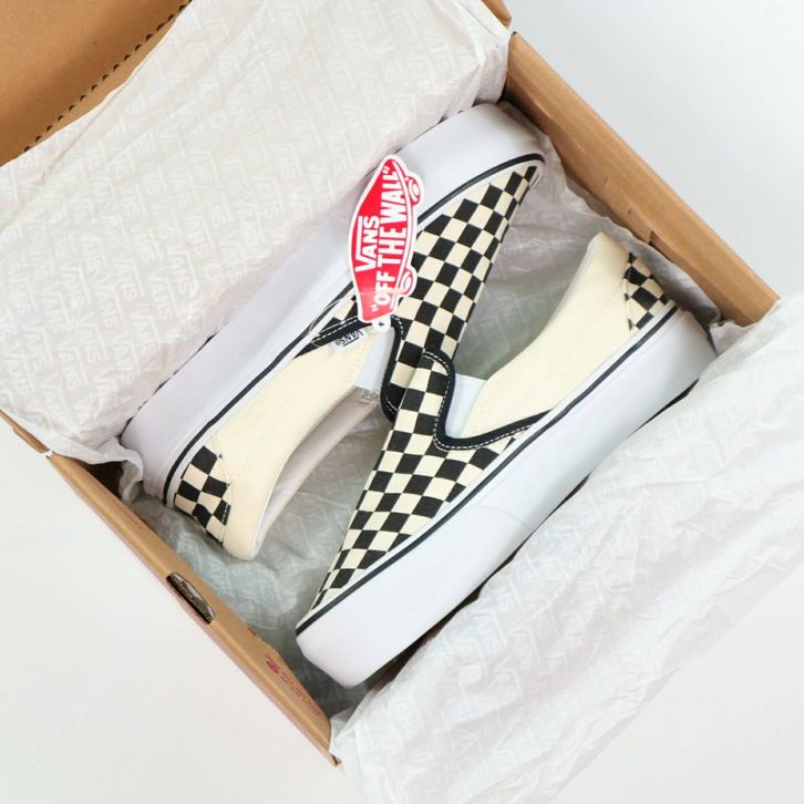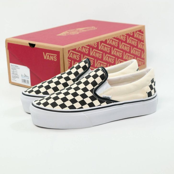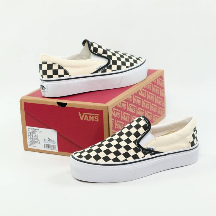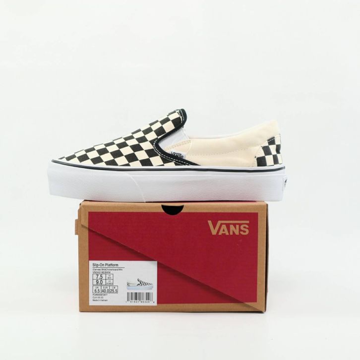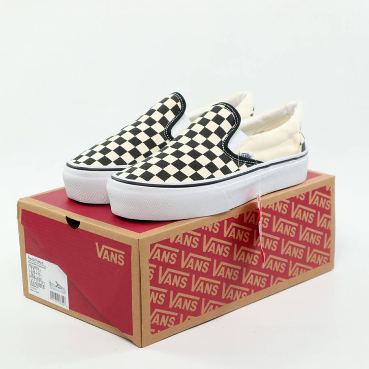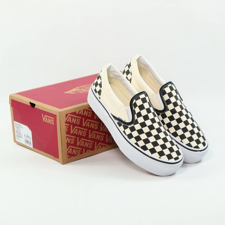 SEPATU VANS SLIP ON CLASSICS PLATFORM CHECKERBOARD BLACK WHITE ORIGINAL BNIB FULL TAG BARCODE BAHAN LEATHER CANVAS
