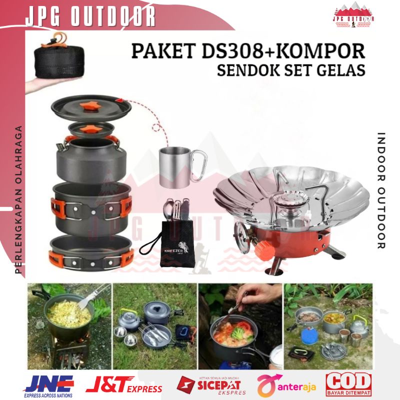 PAKET COOKING SET NESTING DS 308 PLUS KOMPOR KOTAK KEMBANG GELAS SENDOK GARPU LIPAT