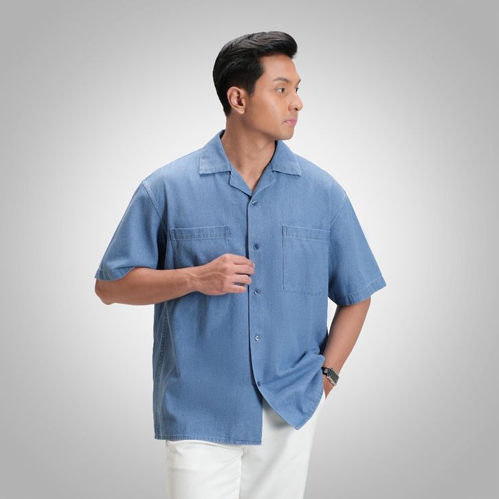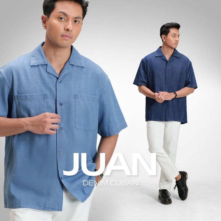 KEMEJA DENIM CUBAN CAMP BOWLING T SHIRT M L XL XXL LENGAN PANJANG JUMBO BIG SIZE CASUAL KATUN PREMIUM